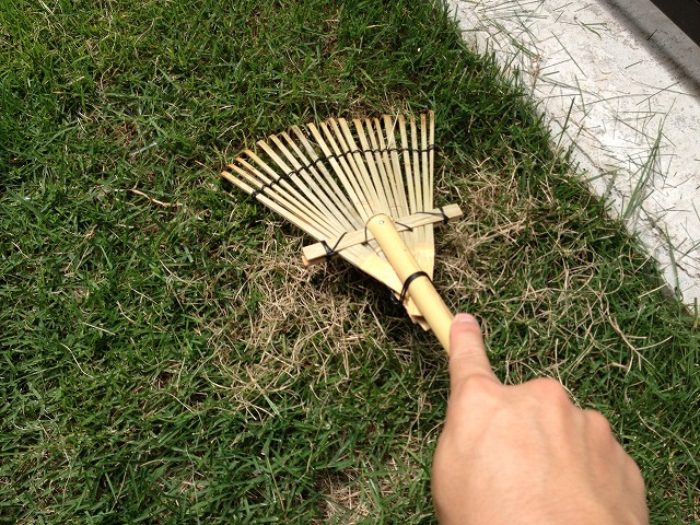サッチングとは、溜まった芝のカス(サッチ)をかき出す作業である。サッチは放置してもなかなか腐らないので、サッチングをしてあげないと溜まる一方である。すでにイデコンポを投入したが、さび病の緊急対策のためイデコンポの効果が出るまで待てないので、さび病エリアのサッチをかき出して風通しをよくした。他のエリアへの伝染を予防するため、オーソサイド水和剤80もついでに蒔いた。
