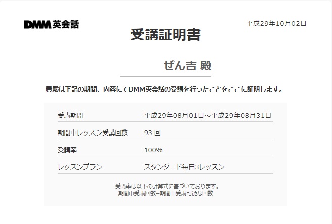 DMM英会話2017年9月の受講状況