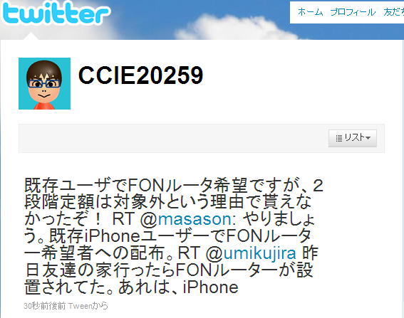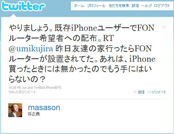 これで世界のfonルータへのwifi無料接続できるようになった。 なお、iPhoneユーザならfonルータはただでもらえるという。 http://mb.softbank.jp/mb/information/details/100513.html 今のfonルータはヤフオクで買ったもので、買った直後に禿げが次のようにtweetしやがった。。。 言うのおっせーよ。 くやしいから、最寄のソフトバンクショップから2つ目のfonルータもらってこようとおもったら、2段階定額が対象外ってくれなかった。 禿げしく無駄足だったから、RTしてやった。どうせ返事は返ってこないけど。 後から制約条件つけるなんて子供給付金みたいでやな気分。