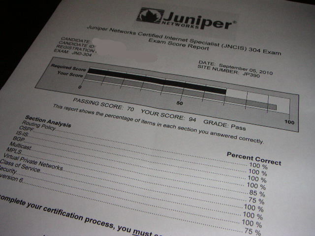 それは街にあるポスター、表示などに埋もれたNW用語を探し出すことです。 例えばこれ、 LDP Label Distribution Protocol、CCIE-SPホルダーならこのリストバンドぜひほしいぞ。売ってないのかな~? LDPときたらTDP(Tag Distribution Protocol)ということで、TDPを探すことに。。 あ、あった。でもちょっと違うのを見つかった。 "a"さえなければ完璧だったのに・・・悔しい。 そんなわけで?JuniperからもらったJNCIA-EXとJNCIS-SECの無料クーポンを持って、はしごで受けてきた。 これでしばらくはJuniperの試験から離れて、Voiceにシフト。 【JNCIS-SEC & JNCIA-EX簡単メモ】 ・合格点 80点 ・問題数 60問(JNCIA-EX), 75問(JNCIS-SEC) ・試験時間 各2時間 ・全部選択、シミュレーション問題なし ・複数選択問題が多い ・Configuration見て判断する問題数問 ・学習教材 Fast Trackからダウンロードできる資料 ・実機学習 なし ・スコアレポートのJマークが古いのまま ![]() Fast TrackにあるJNCIA-EXの勉強資料を一通り読んだので、引き続きJNCIS-SECの勉強資料に目を通している。基本的にこれもJUNOSなので読みやすい、加えてPIXルータの考え方とほぼ同じなので理解しやすい。 1台が10万円以下なのでJUNOSの勉強に買ってもいいレベルの値段。SRX100は3個のVirtual Routerまでサポートしているのに対してSRX210は10個サポートしている。JNCIPラボを組むを前提に購入するとすればSRX100ではなくSRX210を買ったほうが安上がり。 こっちもJNCIA-EXと同様で、Juniperから無料クーポンもらっているので、資料を読み終わり次第一発受けてくる。 |
