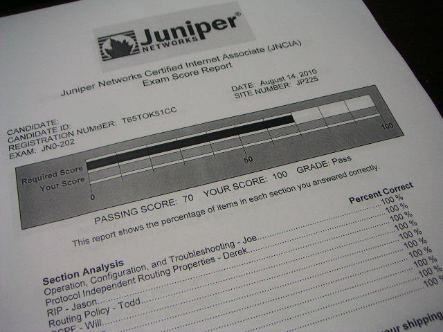 )結果は普通に合格してるし。少しは筆記試験恐怖症から立ち直ったかもしれない。 Core Knowledgeもこのぐらい直球なら全部打ち返してやれるのに。。。苦悩は続く・・・ 【JNCIA-M/T簡単メモ】 ・合格点 70% ・問題数 60問 ・試験時間 2時間(実際30分で終了) ・JUNOS知らなくても7割はとれる? ・ISIS,Multicast,MPLSの問題にOEQに酷似のものも! ・全部選択、シミュレーション問題なし ・学習教材 SYBEX ・実機学習 最近触ってません ・ネタ 各セクション名に人名が入ってる。問題作者? ・スコアレポートのJマークが古いのまま