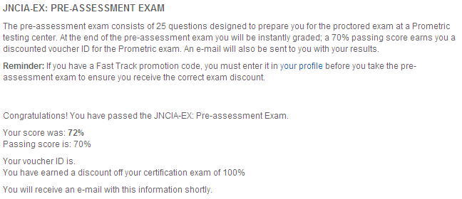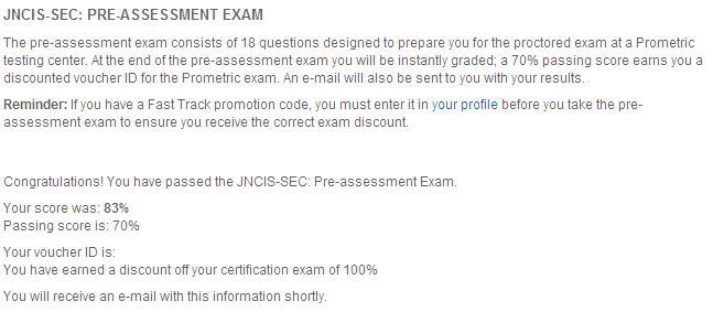 例によってJuniperのただで試験受けられるキャンペーンが気になり、JNCIA-EXとJNCIS-SECのPre-Assessmentをパスしてプロモーションコードをいただきました。