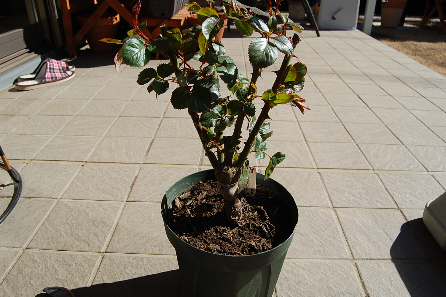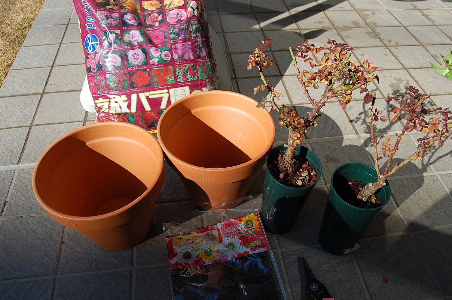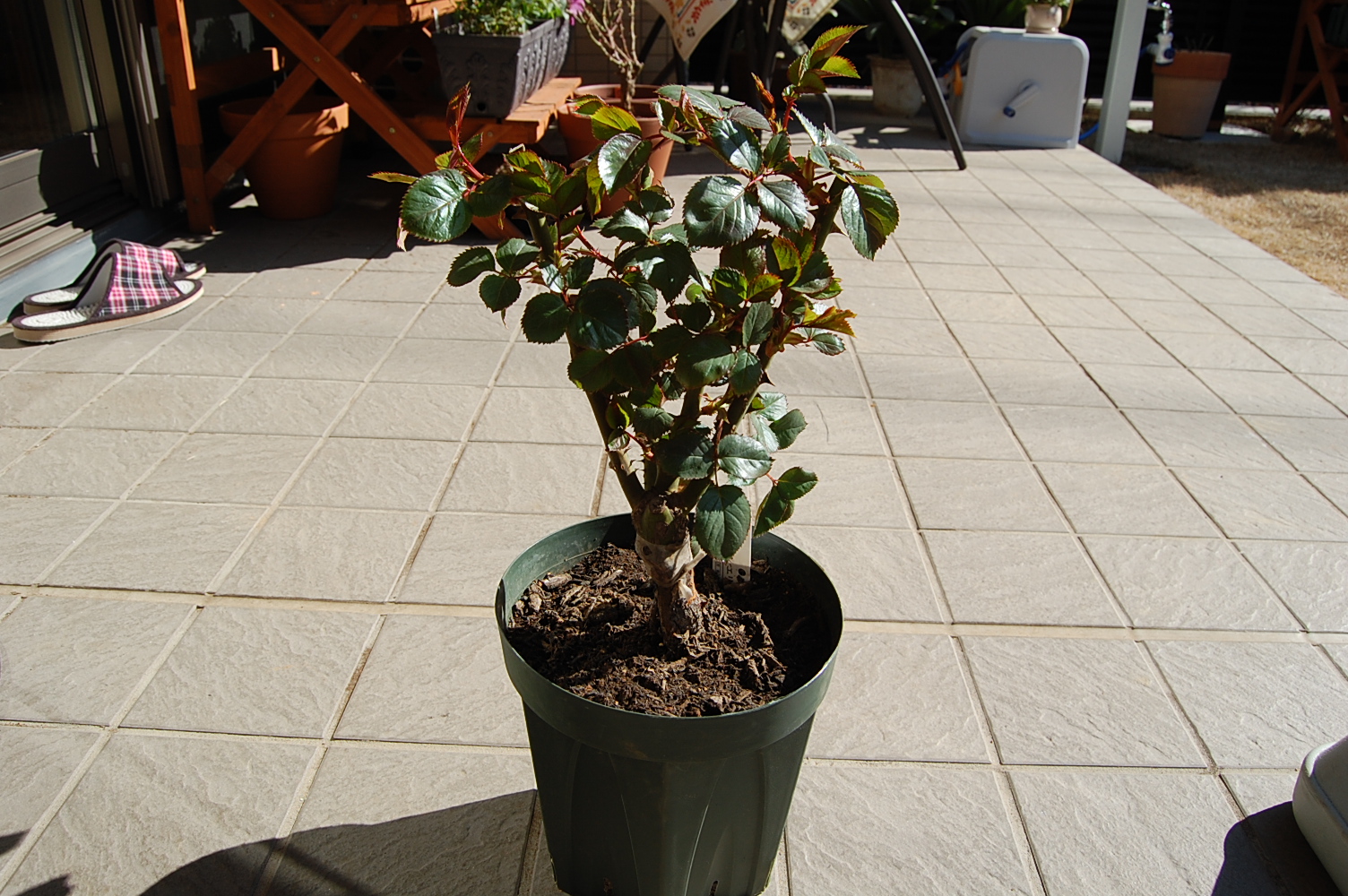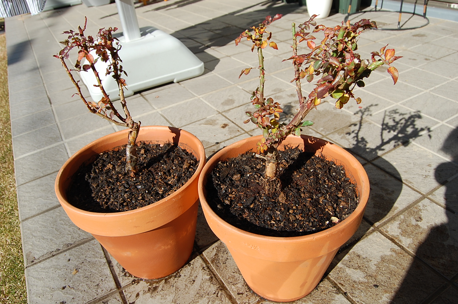 バラの大苗は、日当たりの良い軒下に置いているため、日中も暖かいせいか枝から勢いよく芽が出始めている。特に、クイーンエリザベスの樹勢が強く、早くも葉っぱが満ちてきた。内芽の枝や交差する枝はいずれバラの成長に悪影響を与えるので、今のうちに芽かきしてあげる必要がある。