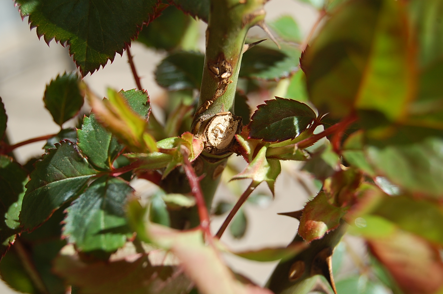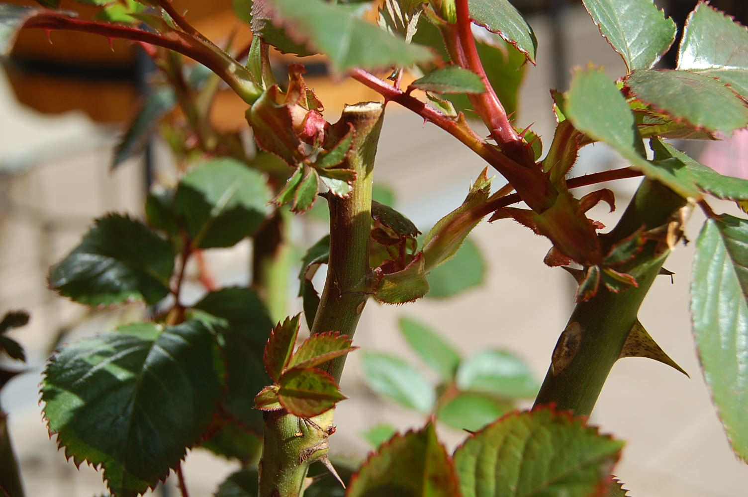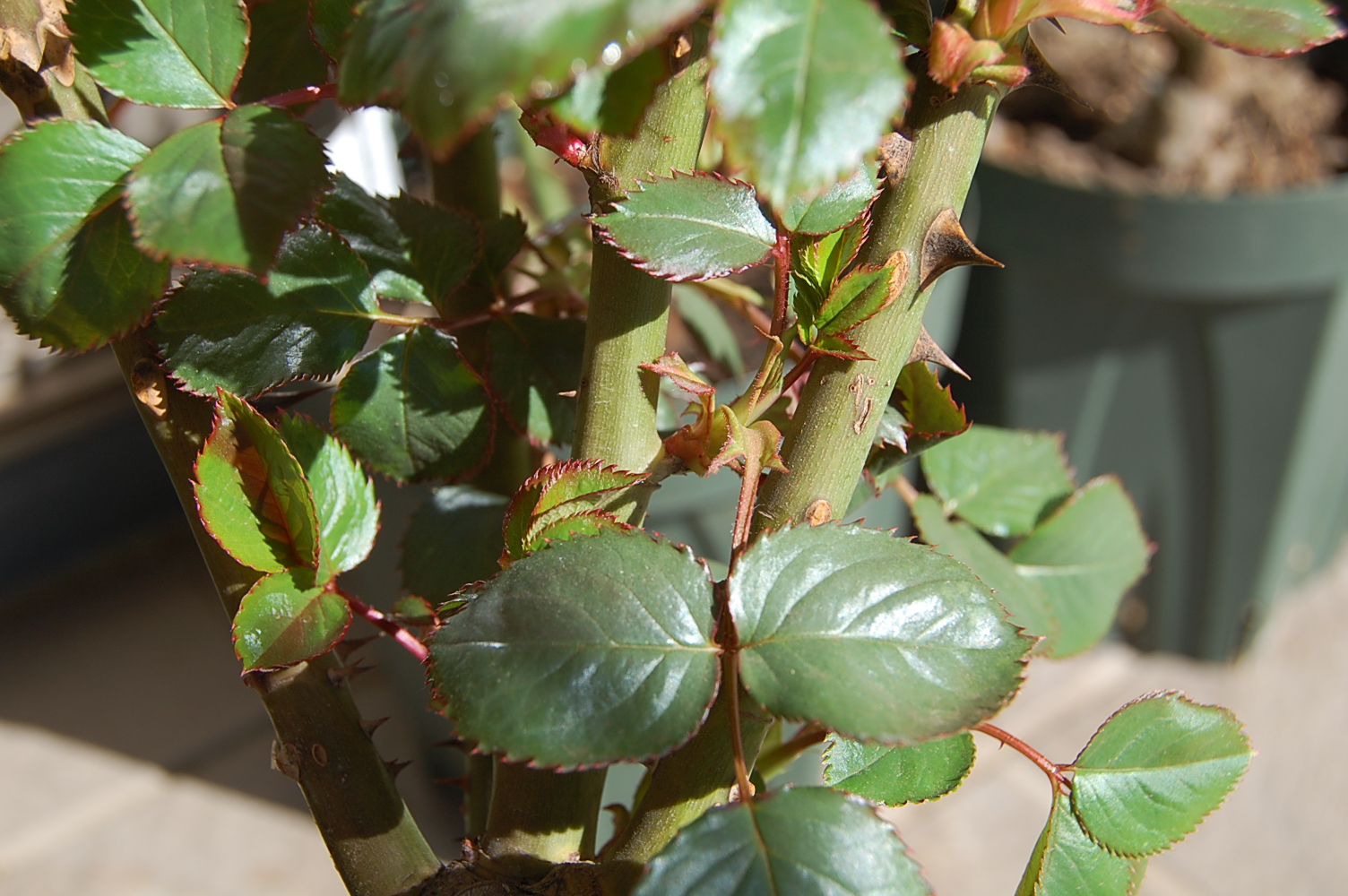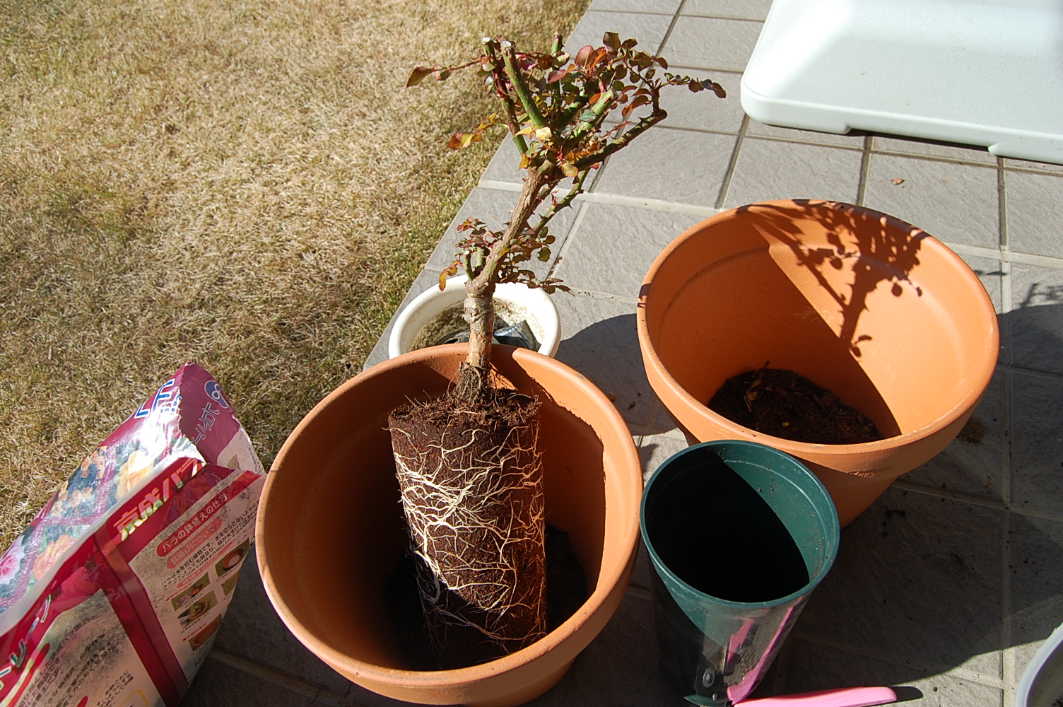 バラの大苗は、日当たりの良い軒下に置いているため、日中も暖かいせいか枝から勢いよく芽が出始めている。特に、クイーンエリザベスの樹勢が強く、早くも葉っぱが満ちてきた。内芽の枝や交差する枝はいずれバラの成長に悪影響を与えるので、今のうちに芽かきしてあげる必要がある。