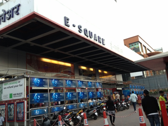 夜はボリウッドデビューをするためにE-Squareというシネマへ行った。インド人の娯楽は映画、インドの映画といえばボリウッドでいきなり大勢で踊り出す。会社の近くのバス停からE-Squareへ向かうバスがあるので、初めてインドのローカルバスにも挑戦した。バス停にボーっと立っているだけで日本と同じようにバスが勝手に止まってくれない。手で合図をするとバスは完全に止まらずに速度は減速され、タイミングよく飛び乗りをする。身体障害者はもとより子供と年寄りもまず乗ることは無理だろう。バスに乗ったら切符売りがやってくるので行き先を告げてお金を払う。今日は約5キロの道で9ルピーでした。リキシャなら50ルピーは必要であろう。そして降りる時に前のドア近くにでスタンバイして乗るときと同様に一番速度が落ちた所で飛び降りる。インド人は前のドアでも構わずに飛び乗ってくるから怯まずに飛び降りないと永遠に降りることはできない。