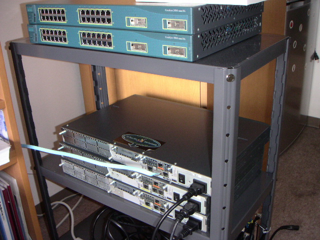 ルータ3台にスイッチ2台。ルータのファンは下にあるので、このままじゃいけないのでずらして段段畑にするか、100均で小道具買って対応しないといけない。スイッチのファンは横にあるからこのまま重ねておk。