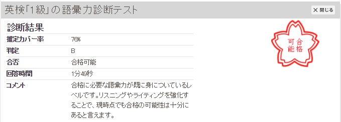 パス単を一通り終わった時点でweblioの英検1級の語彙力テストを受けたところ、判定Bをもらえました。3週間前はCまたはDしか出せなかったので、確かに効果はあったと感じています。