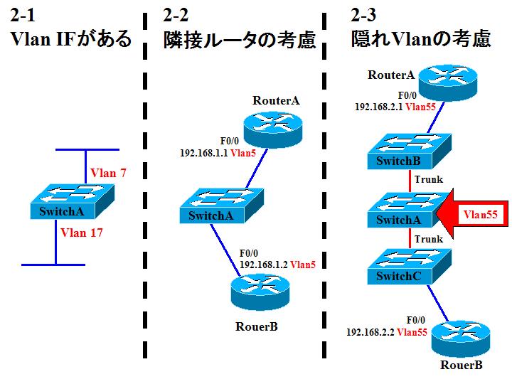 大抵の場合、どのスイッチにどのようなVlanを設定するかについては一切明確に書いてません。 以前、ブログでも納得できないまま、ワークブックの不備として片付けた。サブさんのCCIE受験記にも同じようなことが書かれています。同じ、悩みをもつ人は必ずもっと大勢にいるはずです。 しかし、最近ラボ演習を数多くやったお陰でいつの間にか分かったようになった気がする。今までの自分が思い込んできた「ワークブック側のミス、不備」ではなく自分が今まで未熟だったことが悟ったのです。まだ完全とは言えませんが、自分なりのVlanアサイン対策を公開します。 さて、IEWBでのVlanアサインに関係する問題は大きく2パターンあります。 パターン① 特に指定なし パターン② 必要最小限のVlanアサイン パターン①はとても簡単です。 要するに、各スイッチで全てのVlanを作成すれば終わりです。 厄介なのは、パターン②で、必要最小限というのがミソ。1つでも多いVlanをアサインすればその時点でアウト!であとはいくらやってもそのタスクは0点です。 じゃどうすれば、無駄なくすべてのVlanを見つけるかは以下の3パターン(2-1,2-2,2-3)を実施してみはどうしょうか? パターン2-1 Vlanインターフェースがある場合。 この場合、スイッチがもつVlanインターフェースのVlanをアサインする。 パターン2-2 隣接ルータを考慮した場合。 論理トポロジ図では分からないが、物理トポロジ図で、物理的に隣接するルータのインターフェースが所属するVlanをアサインする。 パターン2-3 隠れVlanの考慮。 これが一番難しい。下の説明図で言うと、ルータAとルータBのインターフェースF0/0は同じVlan55に所属するが、ともにスイッチAには物理的に繋がっていない状態です。したがって、Vlan55のpingを通すにはスイッチBとスイッチCにVlan55をアサインするだけではだめで、スイッチBとスイッチCの間にあるスイッチAにもVlan55をアサインする必要がある! あ、あとはIEWBは間違いも所々あるので、注意してください。例えばラボ10の最初でいきなりです。 |