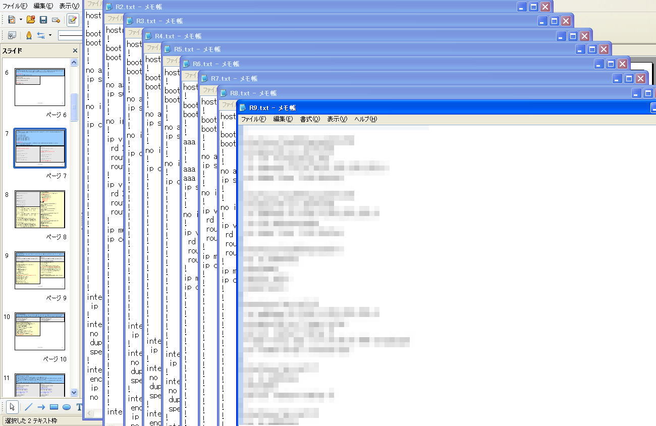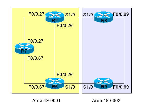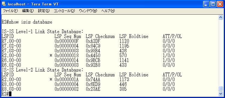 interface FastEthernet0/0.89ip address 8.8.89.8 255.255.255.0 ip router isis isis circuit-type level-1 ! interface Serial1/0 ip address 8.8.28.8 255.255.255.0 ip router isis encapsulation frame-relay clns router isis isis circuit-type level-2-only frame-relay map clns 802 broadcast frame-relay map ip 8.8.28.2 802 broadcast no frame-relay inverse-arp ! router isis net 49.0002.0000.0000.0004.00 R9 interface FastEthernet0/0.89 ip address 8.8.89.9 255.255.255.0 ip router isis isis circuit-type level-1 ! interface Serial1/0 ip address 8.8.69.9 255.255.255.0 ip router isis encapsulation frame-relay clns router isis isis circuit-type level-2-only frame-relay map clns 906 broadcast frame-relay map ip 8.8.69.9 906 broadcast no frame-relay inverse-arp ! router isis net 49.0002.0000.0000.0005.00 ・※印は自分を表す、すなわちR2だす ・R7から3つのLSPが来ている、そのうち2つがpseudonode lspである。ということはR7はR2-R7、R6-R7の2つのセグメント上でDISということになる。この時の全てのルータはデフォルトのプライオリティであるため、SNPAが高いR7がDISと選ばれる。もしSNPAも全部同じならばsystem-idでtie breakしてくれるでしょう。 ・そしてR2-R6のセグメント上ではR6が同様な理由でDISであることが分かる。 ・R2とR6が生成するnon-pseudonode LSPではATTビットが立っていることがわかる。これはR2とR6はL2エリアにつながっていることをL1エリアへの通知ビットとなり、例えばR7はエリア外へ通信するときにATTビット出しているR2とR6へ投げる動作となる。 ・L2のLSPを見るとR8がR2-R8のセグメント上でのL2のDISである 自ルータと接続するエリア内のセグメント数はこれで分かるでしゅ。だから何?それはヒミツ。。。